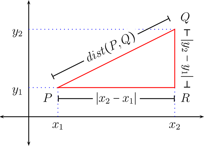 Sean \(P,Q \in \mathbb{R}^{2}\text{,}\) con \(P=(x_{1},y_{1})\) y \(Q=(x_{2} , y_{2})\) entonces la distancia entre los dos puntos es