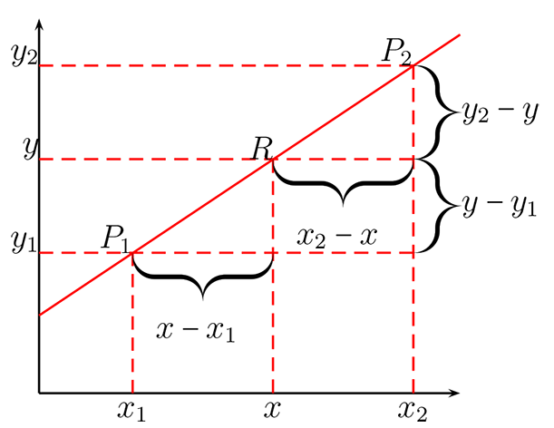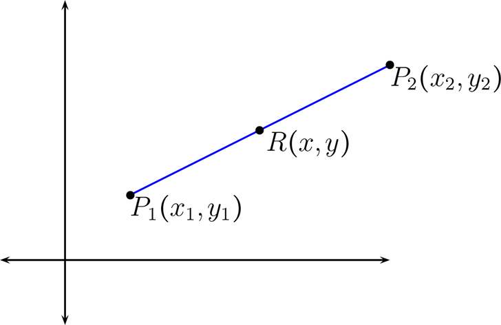 Sean \(P_{1}=(x_{1},y_{1}), P_{2}=(x_{2},y_{2})\) y \(R=(x,y)\text{,}\) de modo que satisface la siguiente razón