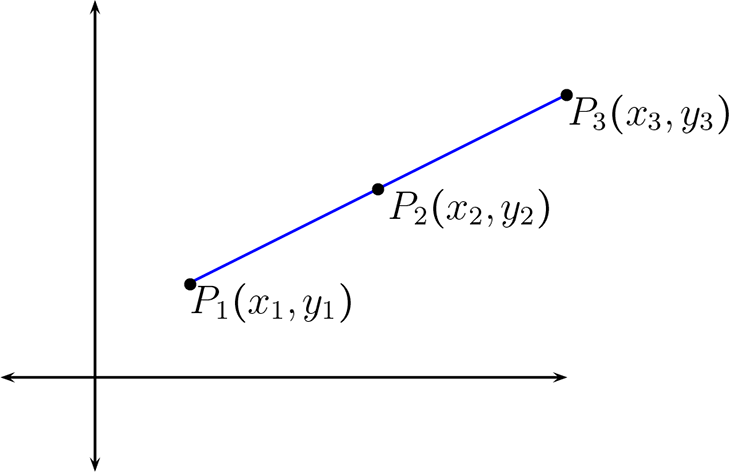 Sean \(P_{1},P_{2},P_{3} \in \mathbb{R}^{2}\text{,}\) diremos que \(P_{1}=(x_{1},y_{1}) , P_{2}=(x_{2}, y_{2})\) y \(P_{3} =(x_{3},y_{3})\) son colineales si y sólo si