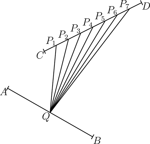 Donde \(Q = (\frac{17}{2},5)\) es el punto medio del segmento \(\overline{AB}\) y \(P_{1},P_{2},P_{3},P_{4},P_{5},P_{6}, P_{7},P_{8},P_{9} \) son algunos puntos colineales a \(C \text{ y } D\)