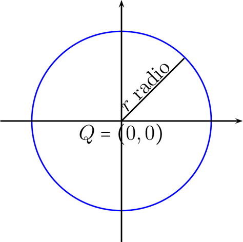 o la ecuación de la circunferencia esta dada por \(\mathcal{C}_{r}(Q): (x - h)^{2} + (y - k)^{2} = r^{2} \text{.}\)