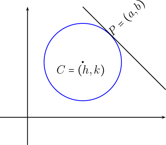 Sean \(Q=(h,k)\) el centro de la circunferencia, \(P\in \mathbb{R}^{2}\) el punto de tangencia entre la recta \(l\) y la circunferencia. Por lo tanto \(l_{PQ}\) es perpendicular a \(l\text{,}\) lo que gráficamente tenemos dado por: