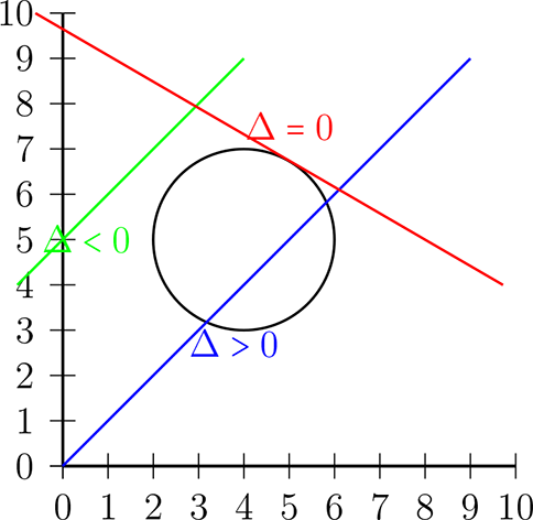 Si \(\Delta \gt 0\text{,}\) se tiene que la ecuación tiene dos soluciones reales, es decir, la intersección de la recta con la circunferencia tiene dos puntos, es una recta secante.