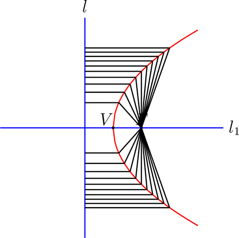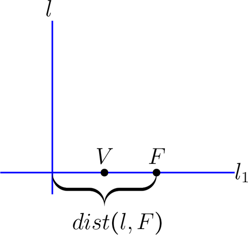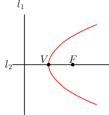Sean \(F,V \in \mathbb{R}^{2}\text{,}\) con \(V = (h,k)\) el vértice de la parábola, \(F=(h+p,k)\) el foco y \(l_1: x= h-p\) la directriz.