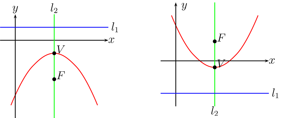 Sea \(F,V \in \mathbb{R}^{2}\text{,}\) con \(V = (h,k)\) el vértice de la parábola, \(F =(h,k+p)\) el foco y \(l_1: y=k-p\) la directriz.