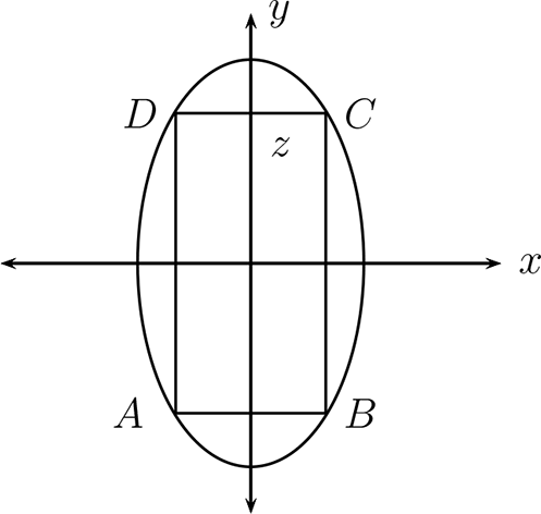 Considere un rectángulo ABCD con sus lados paralelos a los ejes, inscrito en la elipse \(9x^2+4y^2=36\text{.}\) Sea \(z\) la distancia entre un lado vertical del rectángulo y el eje \(y\text{.}\)