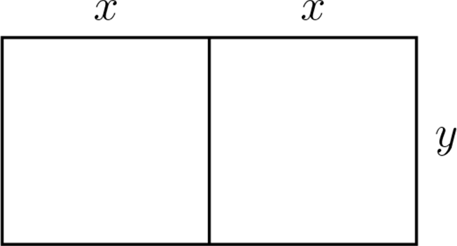 En una parcela, se desea encerrar dos porciones de terreno de igual área (como en la figura) con una malla de longitud \(L\text{.}\) Expresar el área de la parcela en función de \(x\text{.}\)